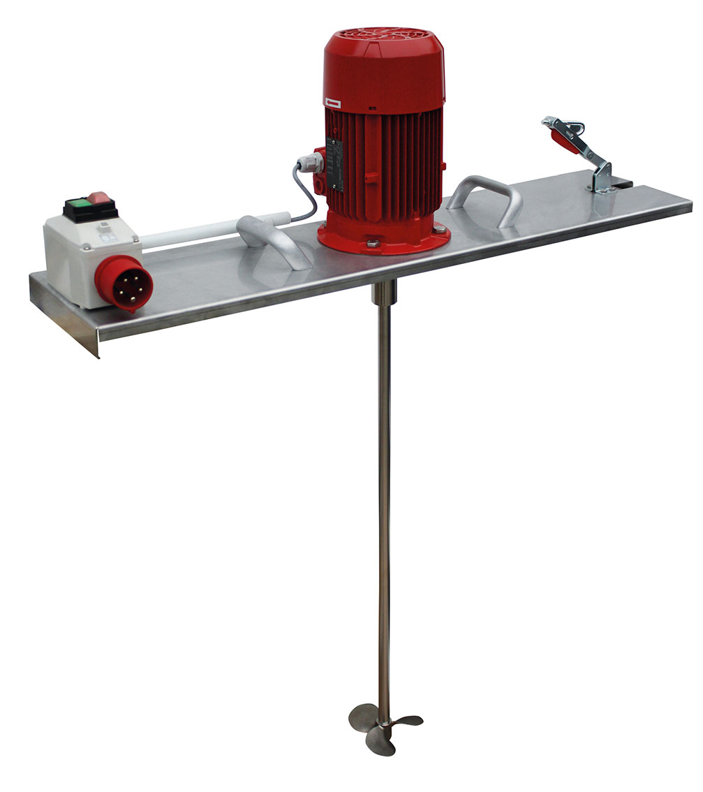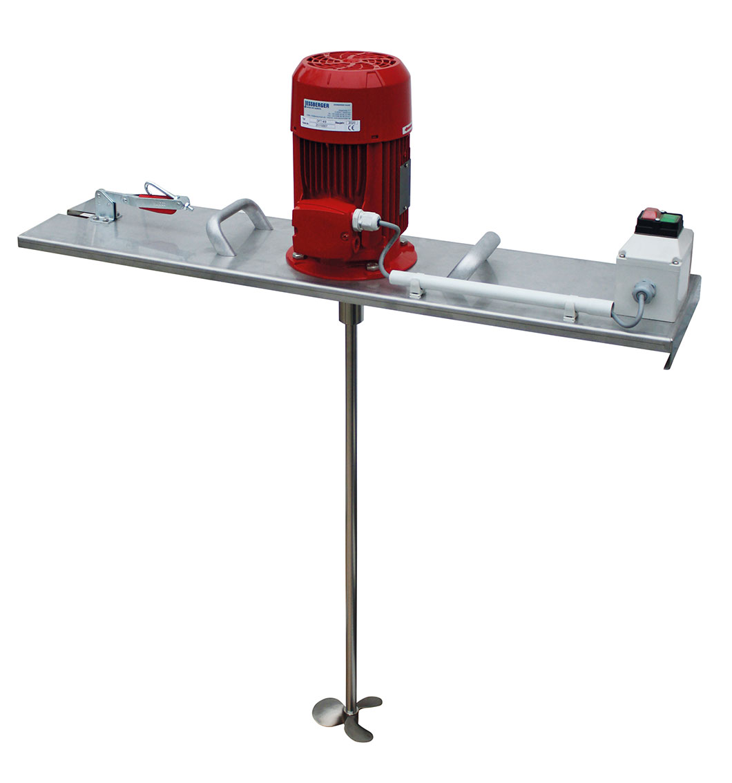 El travesaño V2A está equipado con dos asas de transporte y un tensor de bloqueo. Esto permite un cambio fácil y rápido del agitador. El interruptor de protección del motor con collarín de enchufe CEE de 16A también se encuentra en el travesaño.