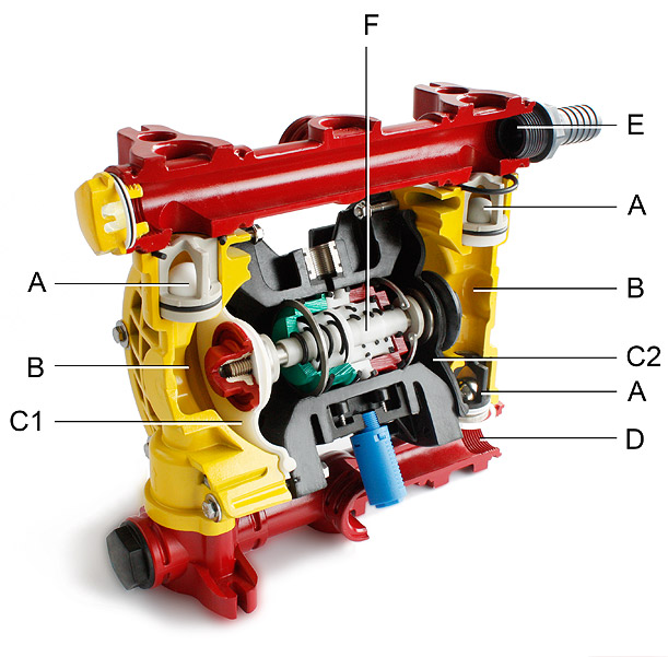 Mientras el diafragma de un lado del eje de la bomba desplaza el medio a través del aire comprimido introducido, el diafragma del otro lado crea simultáneamente un vacío. Como resultado, el nuevo medio bombeado fluye hacia la cámara de la bomba y también es desplazado en el siguiente ciclo de bombeo. A través de las válvulas de bola (que consisten en: Bolas, asientos de bolas y juntas tóricas de diferentes materiales) la cámara de la bomba, en la que se encuentra el medio, se cierra y se abre alternativamente.