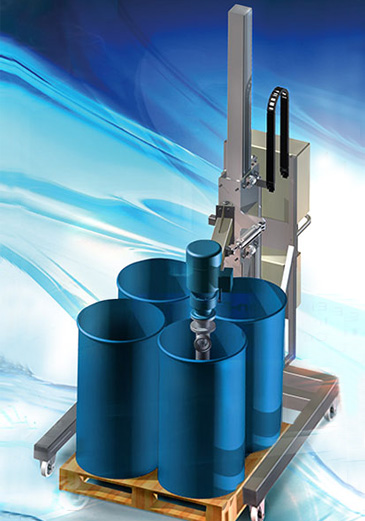 • En la móvil de vaciado de bidones de una columna, se monta una bomba vertical de tornillo excéntrico apta para alimentos a una carretilla móvil con un brazo giratorio. Por medio de un cilindro neumático de doble efecto se mueve junto con este brazo oscilante en la posición final inferior o superior.